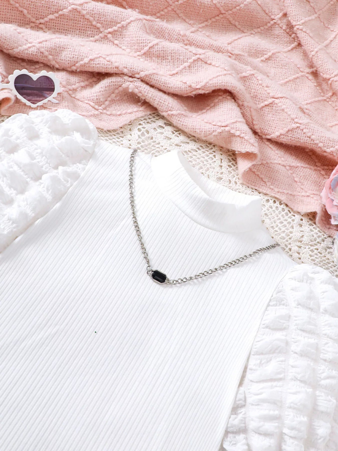 Children's Puff Sleeves Top and Plaid Skirt Set